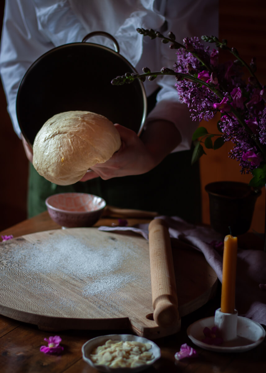 10.Turn the dough out onto a slightly floured surface and split it in 4 equal parts.
