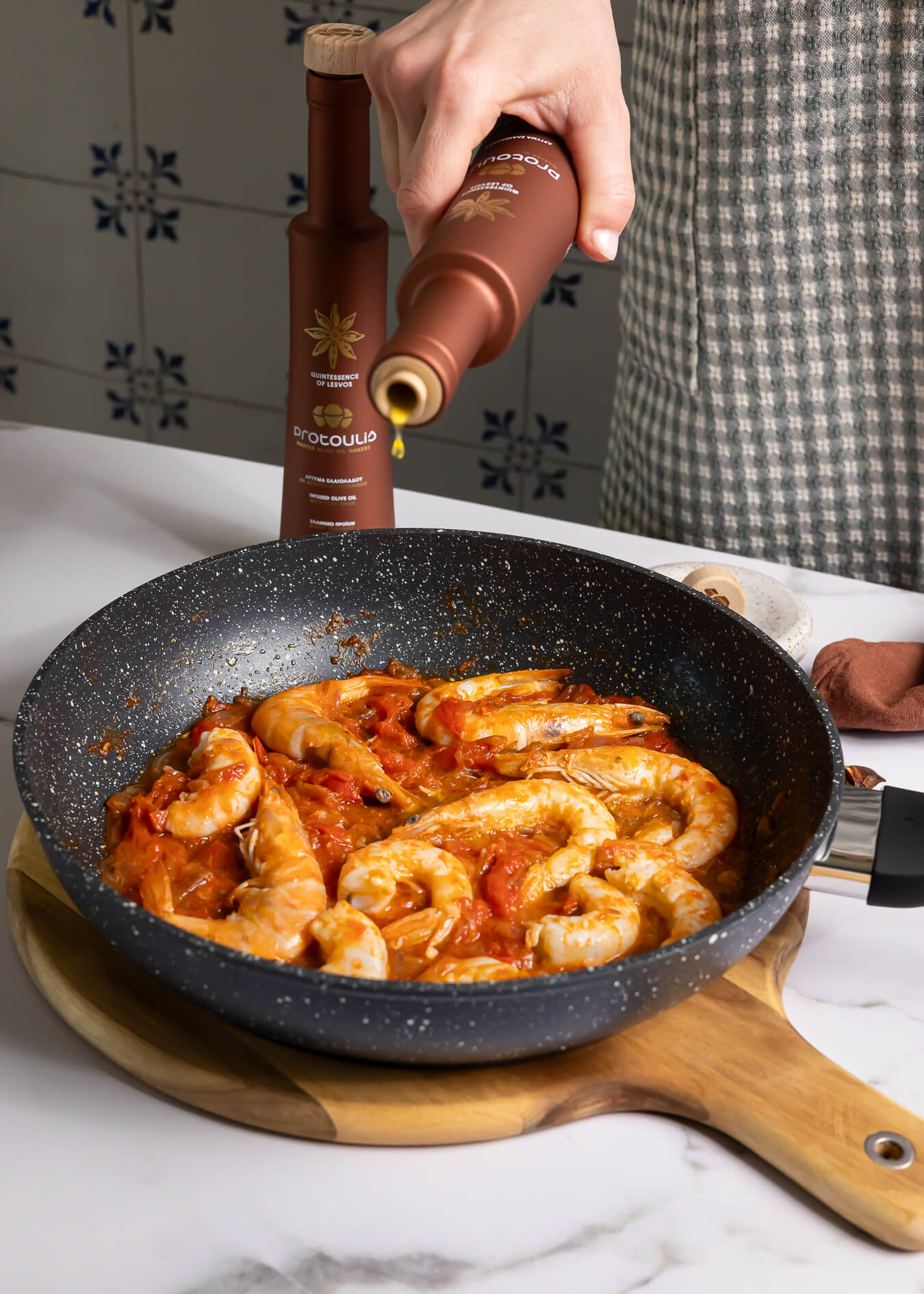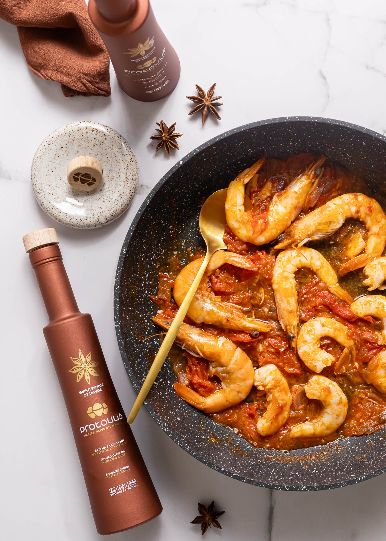 7. Εάν σου αρέσει η πιο έντονη γεύση του «ούζου» , μπορείς να μαρινάρεις τις γαρίδες με το άρτυμα ελαιολάδου με γεύση γλυκάνισου Protoulis, αλείφοντάς τες και από τις δύο πλευρές με πινέλο μαγειρικής. Στη συνέχεια, σωτάρεις τις γαρίδες για ένα λεπτό από την κάθε πλευρά πριν να προσθέσεις τα ντοματίνια και τον πελτέ ντομάτας, τις τοποθετείς σε πιατέλα και συνεχίζεις με τη σάλτσα σου.